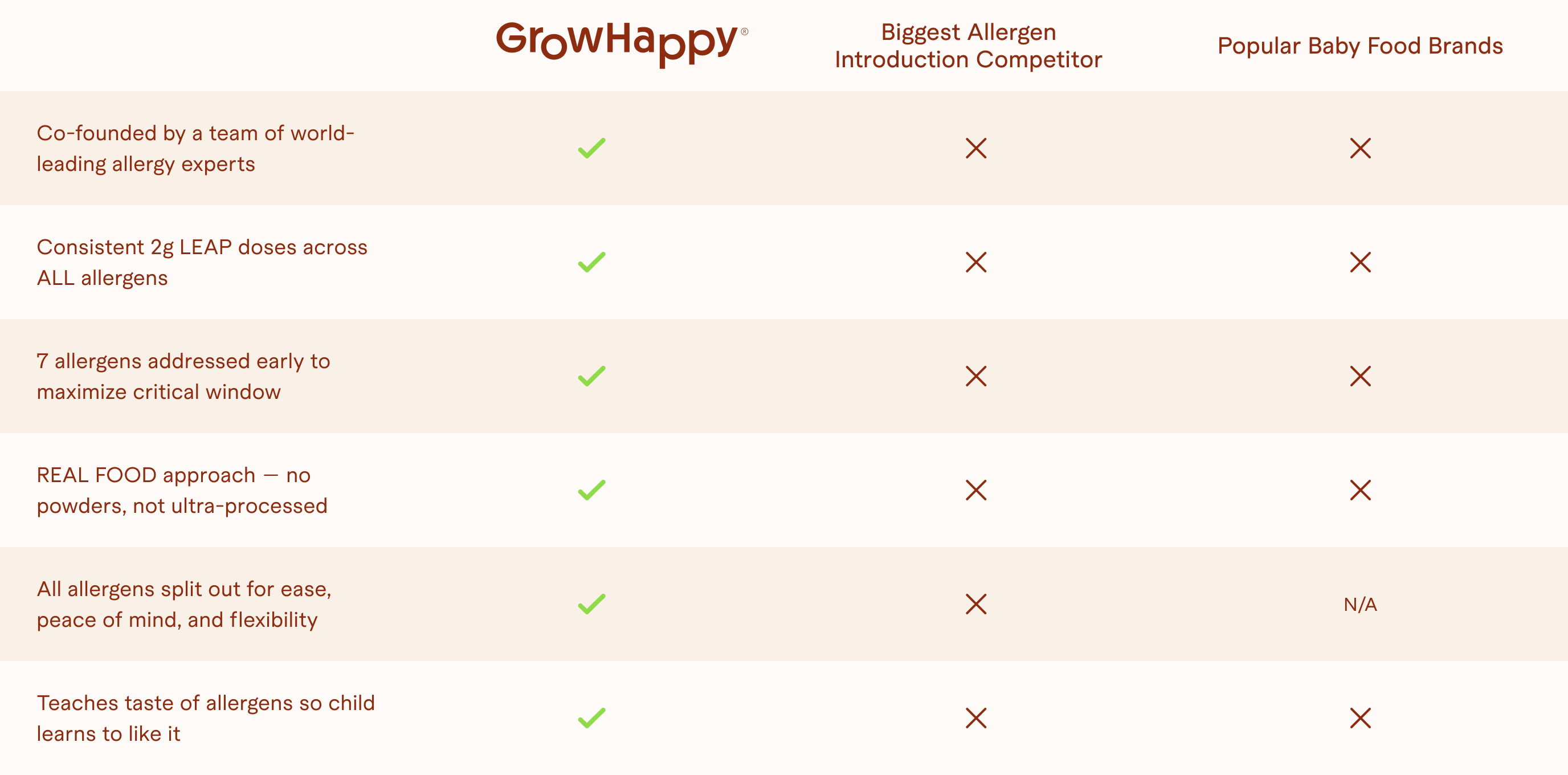 Our son recently turned 6 months, so we've been introducing solids and we wanted to start introducing allergens early. GrowHappy makes it SO easy to do so, and in flavors he seems to enjoy based on how he absolutely devours it! We mix it into a little bit of baby oatmeal, and he loves it.